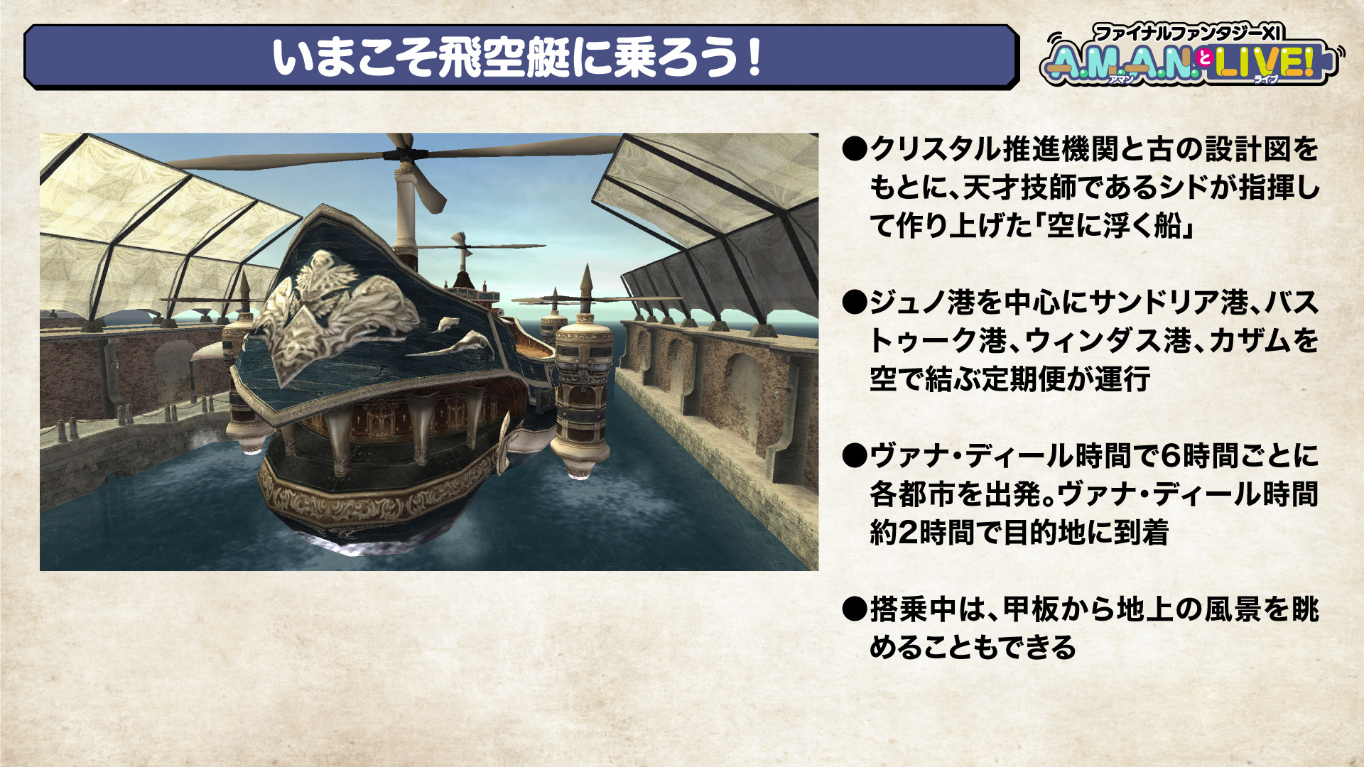 実機プレイを主体とした“ヴァナさんぽ”のコーナーでは、いま改めて飛空艇に注目。ジュノ・カザム間の航路の風景をお届けしています。